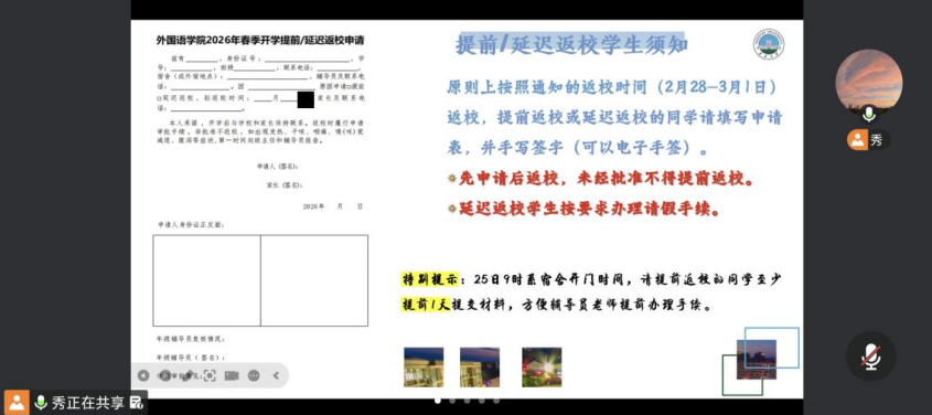 自2月23日起,各班以在线上会议形式开展开学前安全教育与返校工作专题班会。各班班主任围绕返校要求、安全教育、开学初重点工作等内容开展教育。下一步,外国语学院将继续压实工作责任、细化工作举措,全力保障学生平安有序返校。